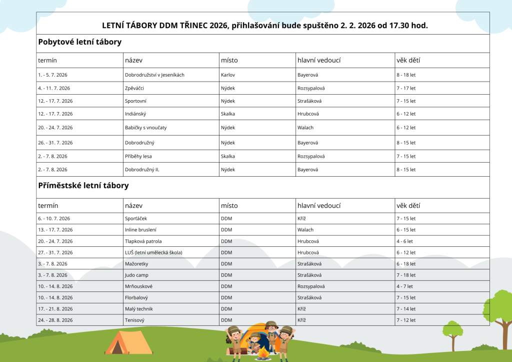 Tabulka pobytových a příměstských letních táborů DDM Třinec, bude během ledna doplněná o ceny LT.