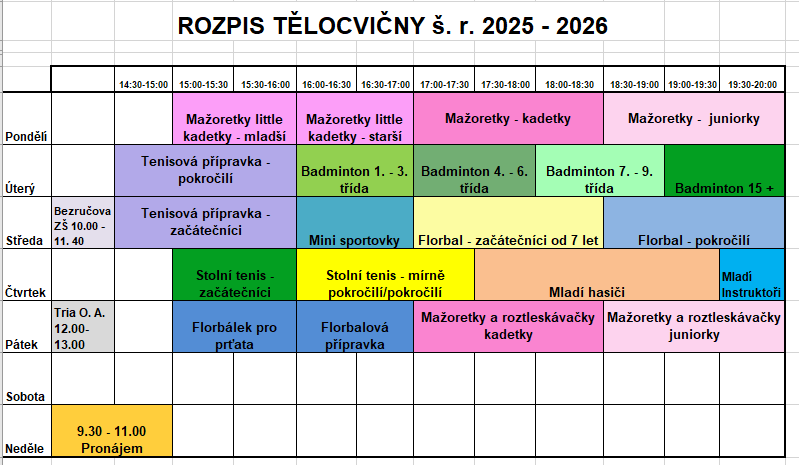 Tělocvična se pronajímá včetně sociálního zařízení, sprch a šaten za 170,-Kč/hod.
